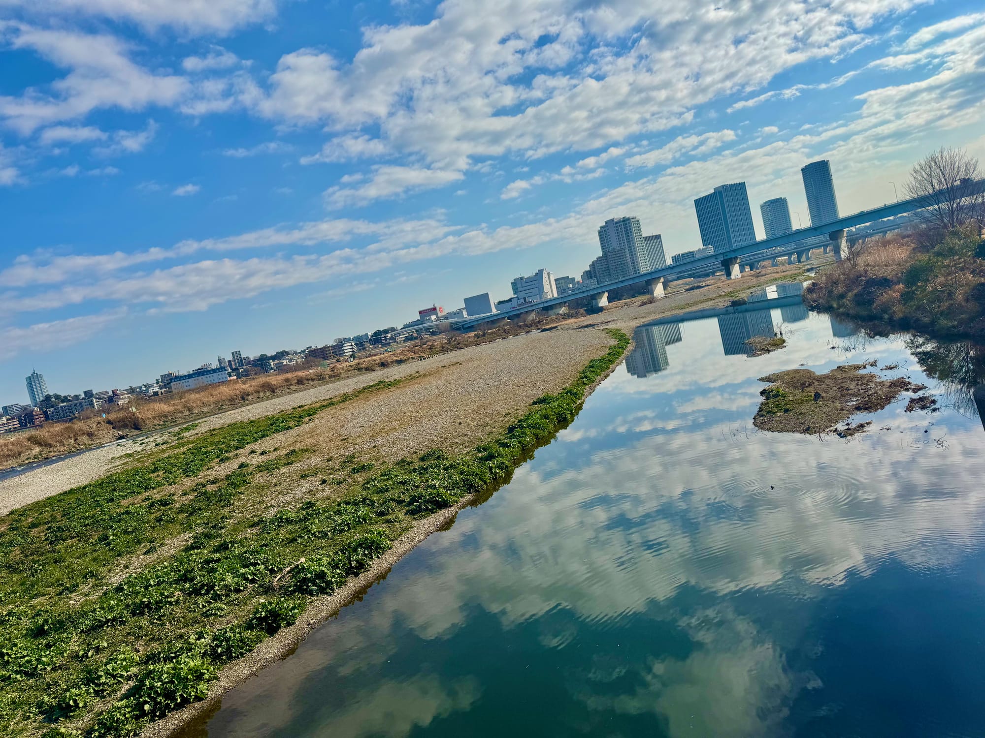 Another meticulously executed Monday morning ride. The Tamagawa presented a striking visual anomaly, its surface a near-perfect specular reflection of the stratiform cloud cover suspended just above. The interplay of refracted light and fluid dynamics rendered the sky and river indistinct, an optical continuum where atmosphere and water merged into a singular, seamless entity.